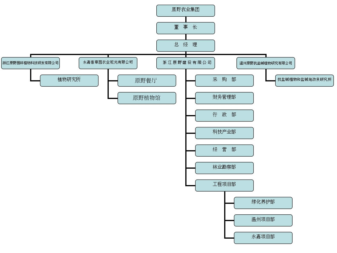 集團總部下轄浙江原野建設(shè)有限公司、浙江原野園林植物科技研發(fā)有限公司、溫州原野抗鹽堿植物研究有限公司、永嘉香草園農(nóng)業(yè)觀光有限公司等。