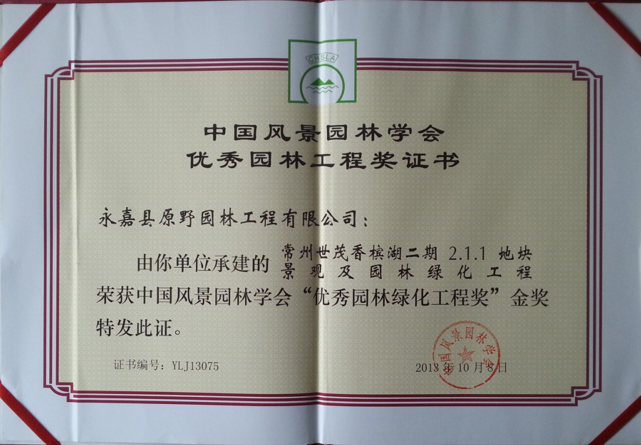 10月25日,由永嘉原野園林公司承建的常州世茂香檳湖二期2.1.1地塊景觀及園林綠化工程獲中國優(yōu)秀園林工程金獎(jiǎng)稱號。