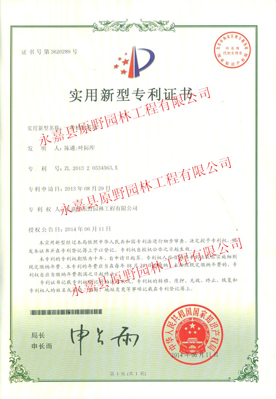 2014-06-306月28日,原野公司收到實(shí)用新型專(zhuān)利證書(shū)。專(zhuān)利名稱(chēng)為一種植物幕墻,由原野公司陳遴、葉際庫(kù)發(fā)明。