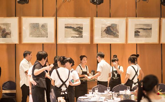 從農(nóng)業(yè)園門口進(jìn)入,就看到2名原野職工身著工作服等候在分叉口,接引各方來賓。12個項目展示牌分立在道路兩側(cè),一進(jìn)門就能感受到濃濃的招商氛圍。會議館由原木與玻璃為主材料搭建,一泉活水圍繞著會館潺潺流動,它就這樣聳立于鮮花與植物的海洋中,與其融為一體,宛若天成。步入會館,入目可見的是原野工作人員忙碌卻有序的身影,主管、策劃人和服務(wù)員分工明確,各司其職,會場井然有序。百名會長緩緩步入會場,首先到簽到處簽名拍照留念,隨后安排入座。會場墻上的永嘉山水畫,配上屋頂暖暖的燈光,營造了“家”的溫馨,隨著商會會長用金粉在百名會長簽名的“圓月”上繪出一個“家”,把會場氣氛推向了高潮。