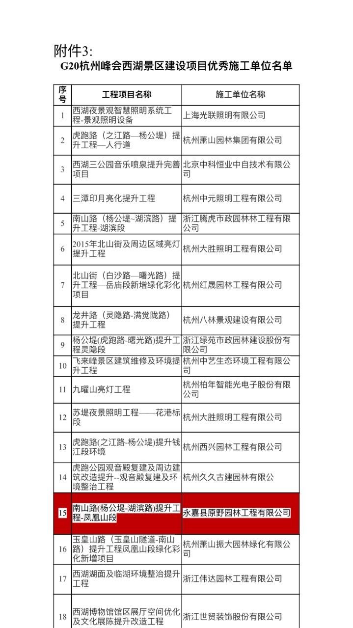 2016年10月,原野公司榮獲 “ 浙江省服務保障G20杭州峰會優(yōu)秀施工企業(yè)”榮譽稱號。共有二十家企業(yè)獲此殊榮:北京一家,上海一家,溫州一家(原野園林),其余十七家企業(yè)皆為省直或杭州企業(yè)。我司承建的G20項目:南山路(楊公堤—湖濱路 ) 鳳凰山路段提升工程,舊貌換新顏,十步一景,鮮花與綠植相映成趣 , 得到了省、市領導及業(yè)內專家的一直好評。
