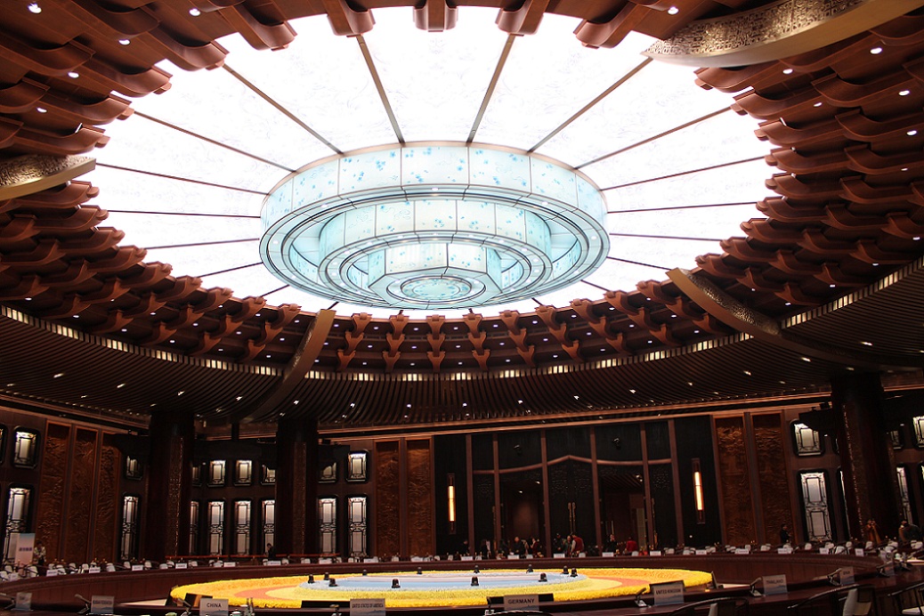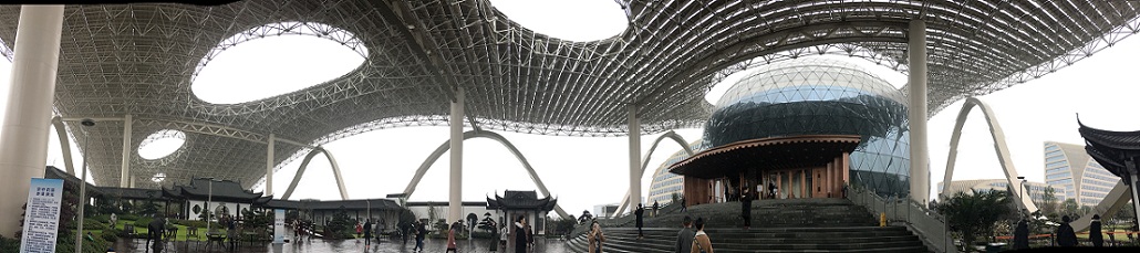 早上8:30,啟程前往杭州國際博覽中心參觀。自從G20杭州峰會后,杭州國際博覽中心就享譽世界,它擁有規(guī)劃建筑面積84萬平方米,設(shè)有展示中心、會議中心、屋頂花園(城市客廳)、地下商業(yè)及車庫等五大功能區(qū)。由于目前只有部分功能區(qū)開放,考察團一行從檢票口進入直接上了二層,按照順序參觀了落客平臺、迎賓大廳、接待大廳,之后搭乘扶梯至四層的主會場,然后再到五層的午宴區(qū)和屋頂花園。其中迎賓區(qū)讓人印象深刻,其門口有六對開放的“月亮門”,傳遞著“有朋自遠(yuǎn)方來,不亦樂乎”的信息,廳內(nèi),我們發(fā)現(xiàn)了不少中國元素,比如四坡屋頂,兩側(cè)八根高大的立柱上裝飾的窗欞圖案。 最惹眼的是中間的大圓桌,直徑有30多米,頂部是三層淡藍色的絹燈,點綴著梅花和桂花圖案,外圈選用了最具中國符號的青花瓷。