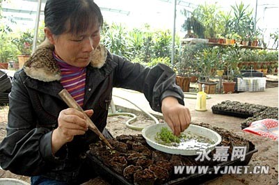 永嘉縣原野園林工程有限公司一直致力于本土樹種的開發,我市提出綠化主推本土樹種后,該公司把無柄小葉榕做為突破口,運用先進的環境調控技術,采用種子容器育苗,解決無柄小葉榕大批量繁育種苗問題,目前已經成功地培育出10萬余棵無柄小葉榕。圖為工作人員正在進行容器育苗。記者汪學斌