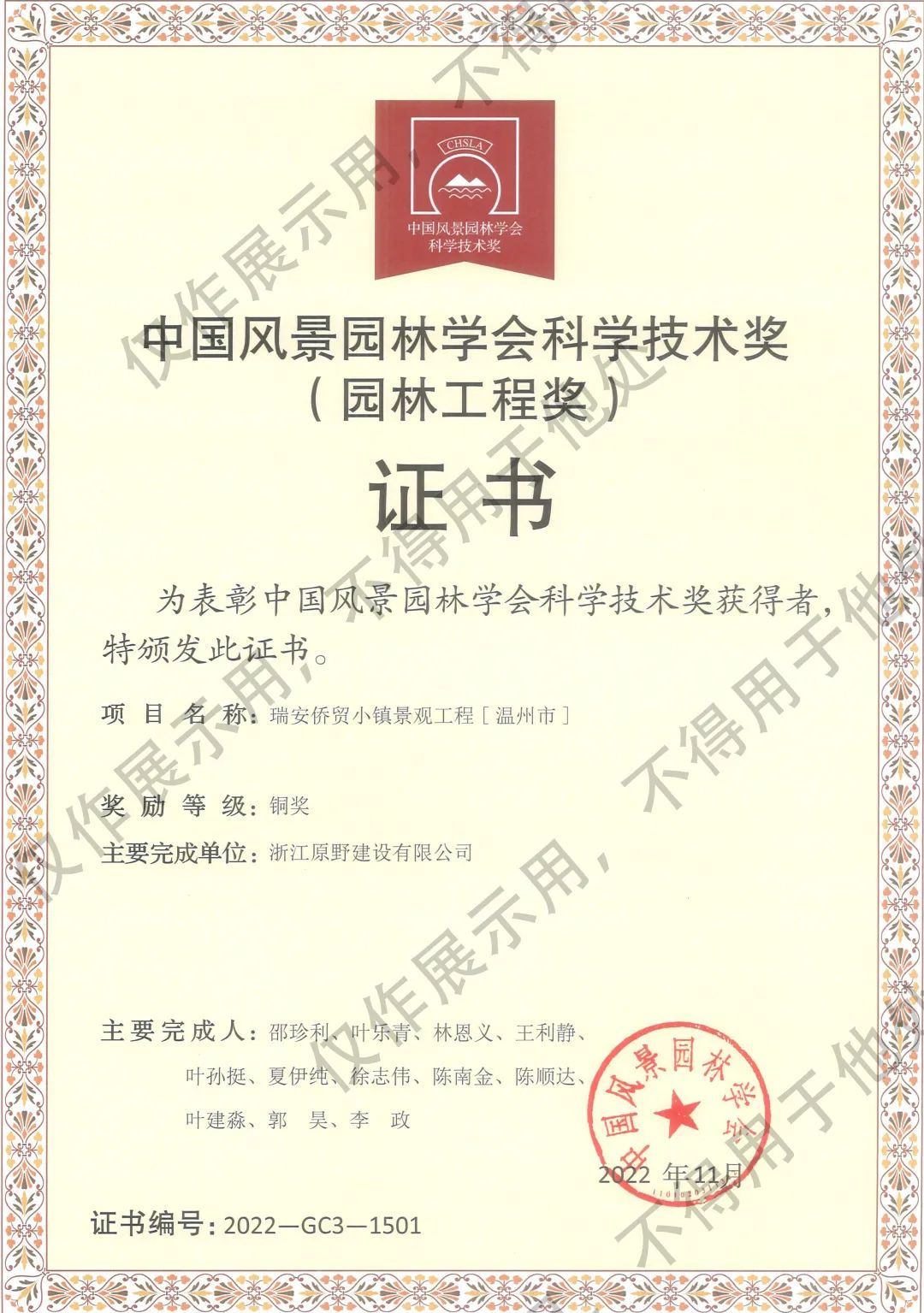 日前,由浙江原野建設(shè)有限公司施工的“瑞安僑貿(mào)小鎮(zhèn)景觀工程”榮獲中國風(fēng)景園林學(xué)會科學(xué)技術(shù)獎(園林工程獎)。