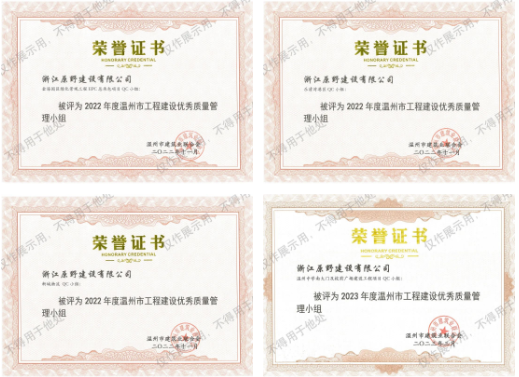 其中,《提高大規(guī)格苗木栽植成活率》課題榮獲2022年度溫州市工程建設(shè)優(yōu)秀質(zhì)量管理QC小組一等獎,《橋梁墩柱外觀質(zhì)量》、《施工現(xiàn)場臨時用電安全管理》等兩個課題榮獲二等獎;金海園區(qū)綠化景觀工程EPC總承包項目QC小組、樂清灣港區(qū)QC小組、新城物流QC小組、溫州中學(xué)南大門及校前廣場建設(shè)工程項目QC小組榮獲溫州市工程建設(shè)優(yōu)秀質(zhì)量管理小組。