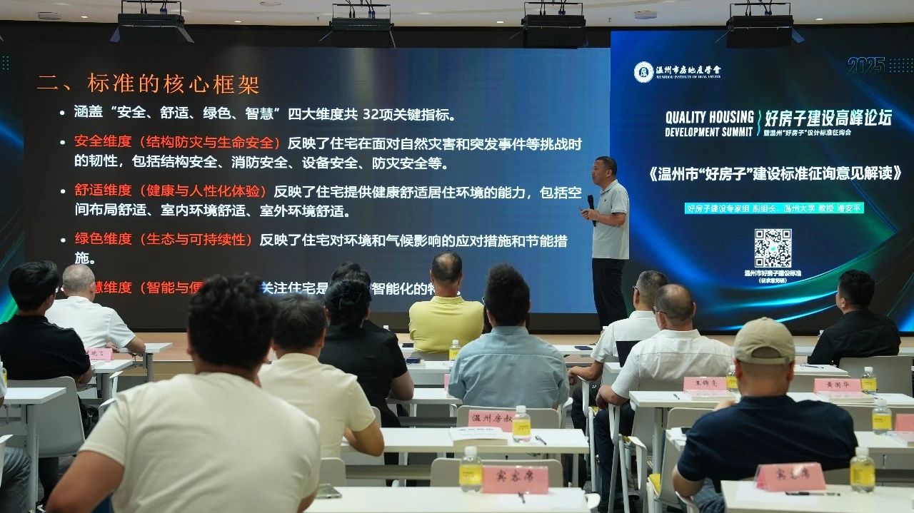 溫州大學(xué)房地產(chǎn)研所長、好房子建設(shè)專家組副組長潘安平教授對《溫州市好房子建設(shè)標(biāo)準(zhǔn)(征求意見稿)》進行了深入解讀。他指出,該標(biāo)準(zhǔn)基于國家最新《住宅項目規(guī)范》,結(jié)合溫州地域特點,圍繞安全、舒適、綠色、智慧四大維度,初步提出32項關(guān)鍵指標(biāo),涵蓋結(jié)構(gòu)安全、隔音通風(fēng)、本土植物比例、智慧物業(yè)等多個方面。